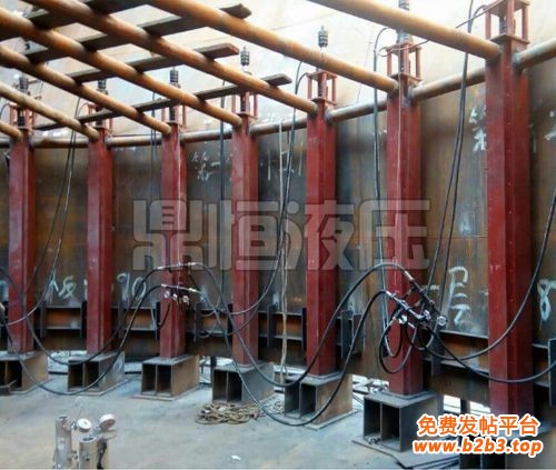 液压设备提升法的操作类似倒链葫芦起吊法,在每个提升柱上安装穿心液压千斤顶,利用液压千斤顶顶升起壁板和罐顶。由于液压操控十分容易,该法可以适用于任何大小的储罐。