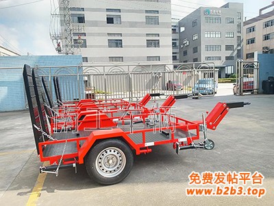 2.拖车承载能为为1.3吨,平台采用型钢焊接而成,宽度1.5米,长度2.8米,板面铺2.5MM厚花纹板,车身尾部带有两个翻转式登车爬梯(爬梯表面焊圆钢防止打滑),车身前边,左边,右边带有固定式护栏,护栏高度0.2米,车体两侧各配3个紧绳器及捆绑挂钩;